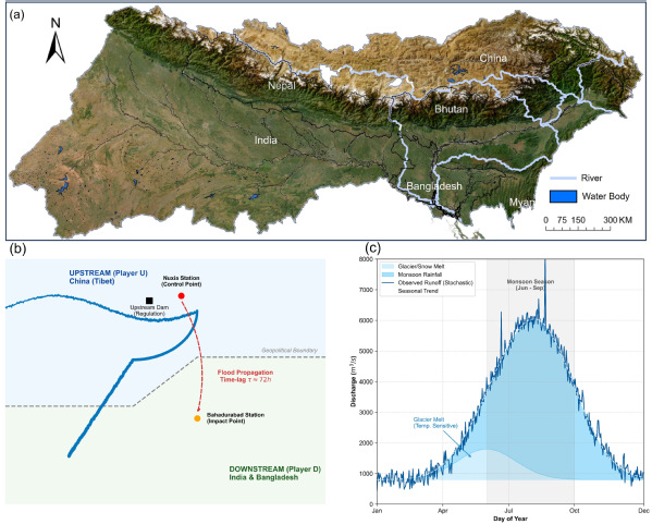 在洪水协同治理方面,团队将视角拓展至跨境流域,将水文传播过程与微分博弈模型耦合。以雅鲁藏布江—布拉马普特拉河为例,研究发现合作情境下上游提前约13天预泄,可使下游洪峰降低19.4%。这表明跨境防洪的关键在于基于物理规律实现错峰协同。